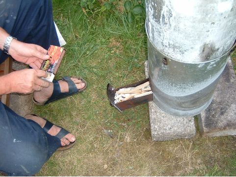 Richtig, man kann sie zum Beispiel räuchern. Also das Räucherfass ausgepackt und in der kleinen Lade Buchenholzspäne untergebracht...