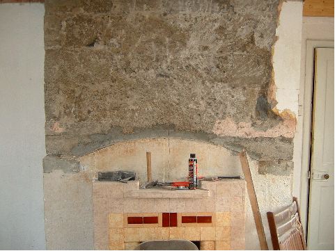 Der Kamin hat schon mehrere Umbaumassnamen hinter sich. Ursprünglich war es mal ein ofen zum Heizen und Kochen der wesentlich mehr platz weggenommen hat. Gross genug um ein halbes Schwein drin zu braten. Der Kamin fing unterhalb von dem Rundbogen an der aus einem alten Autoreifen gefertigt ist. Hinter dem Rundbogen ist der Kaminabzug so gross wie der Bogen. Einen halben Meter über dem Rundbogen geht der Schornstein um 30cm nach hinten weg. Bis zu dieser Kurve ist der Zement aus dem der Hauptteil besteht nur 13cm dick.